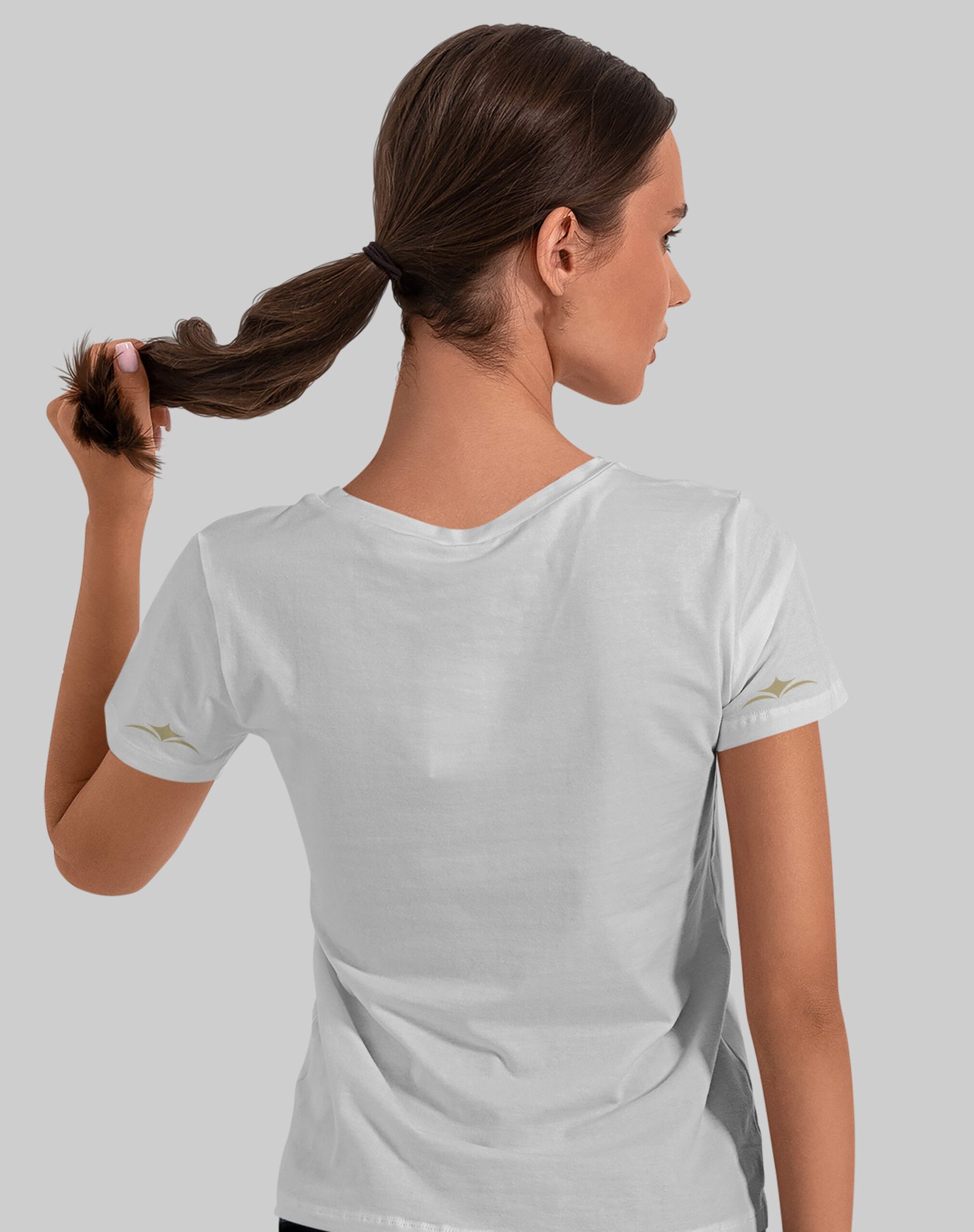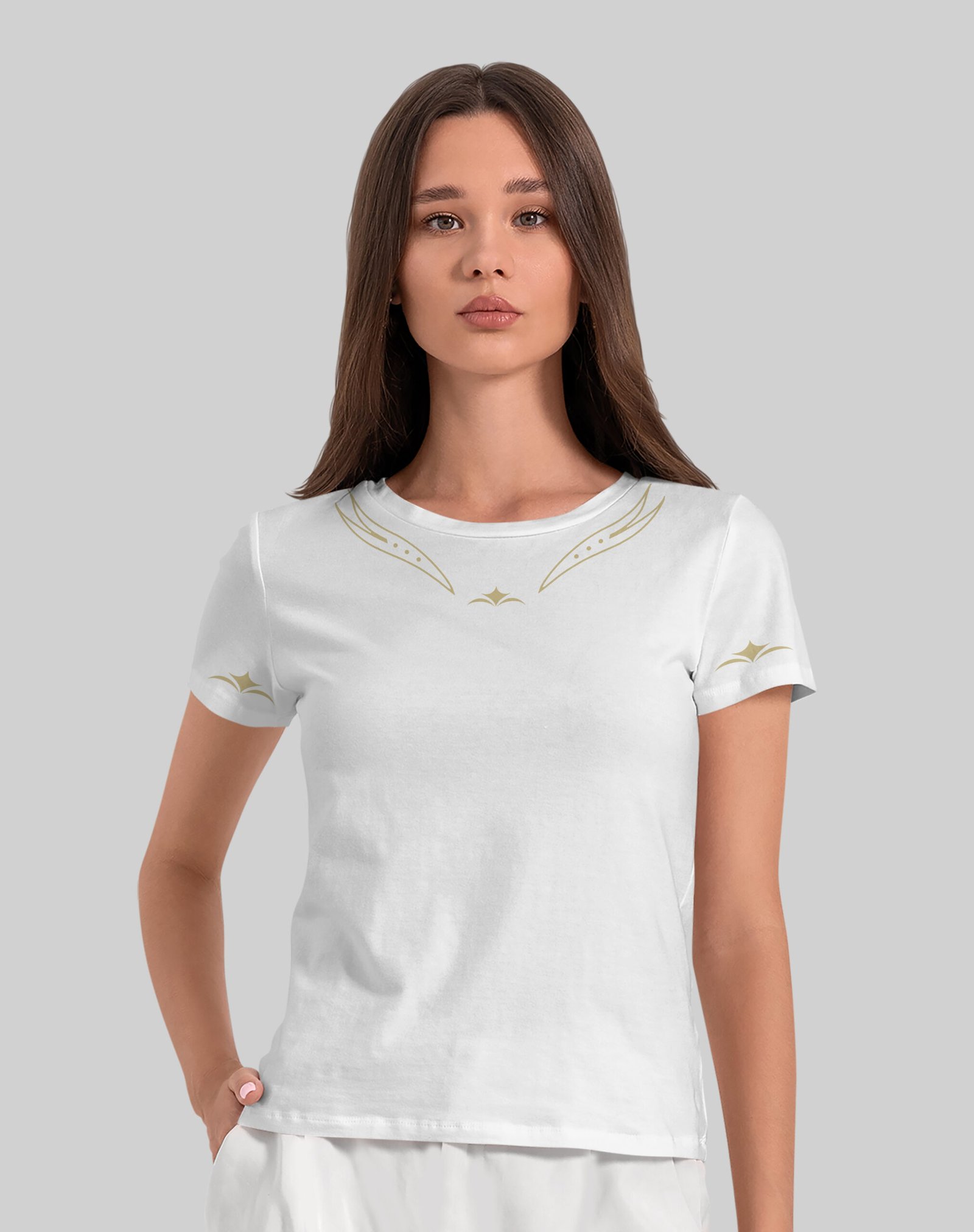 Artwork: The “Corale” T-shirt is an ode to quiet majesty — a refined composition of symbolism and form. Encircling the neckline, a golden necklace-inspired design wraps with fluid precision, ending in a single, minimalist crown — a mark of self-honored royalty. On each shoulder sleeve, the same golden crown rests in quiet symmetry, evoking balance, heritage, and restraint.