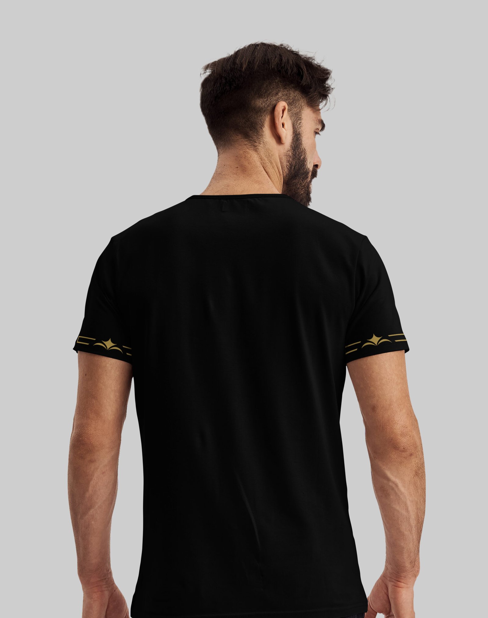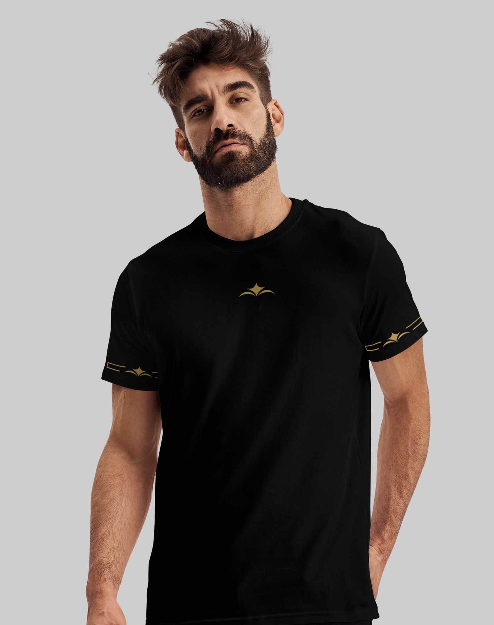 Artwork: The “Conquistatore” T-shirt embodies disciplined elegance and quiet authority. At its center, a small golden crown rests over the chest while each sleeve is adorned with a crown framed by golden lines, forming a bracelet-like motif that wraps the arm in a statement of order and precision.